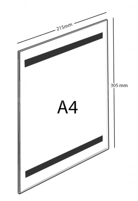 Kapsa na 1 popisku je vyrobena z kvalitního plexiskla tloušťky 2 mm s UV ochranou, ohnutím do "V" s ohybem - základnou po kratší straně, pro vložení 1 ks plakátu (jmenovky, nabídky, cenovky). Kapsa je ze zadní strany opatřena magnetem. Vložené jmenovky (nabídky, ceníky) lze jednoduchým způsobem aktuálně měnit. Kapsa je na výšku i šířku větší o 5 mm než formát vkládaného papíru. Orientace kapsy na výšku. Rozměry v mm.