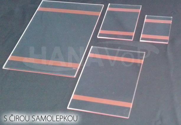Kapsa na 1 popisku je vyrobena z kvalitního plexiskla tloušťky 2 mm s UV ochranou, ohnutím do "V" s ohybem - základnou po kratší straně, pro vložení 1 ks plakátu (jmenovky, nabídky, cenovky). Kapsa je ze zadní strany opatřena čirou samolepkou. Po odstranění ochranné (červené) fólie se lepí na čistý, hladký a odmaštěný podklad (dveře, sklo atd.). Vložené jmenovky (nabídky, ceníky) lze pak jednoduchým způsobem aktuálně měnit. Doporučujeme použití v interiéru pro jmenovky na dveře, obrazové "MENU" v restauracích, aktuální nabídky CK, nabídky nemovitostí RK, či jiné. Kapsa je na výšku i šířku větší o 5 mm než formát vkládaného papíru. Orientace kapsy na výšku. Rozměry v mm.