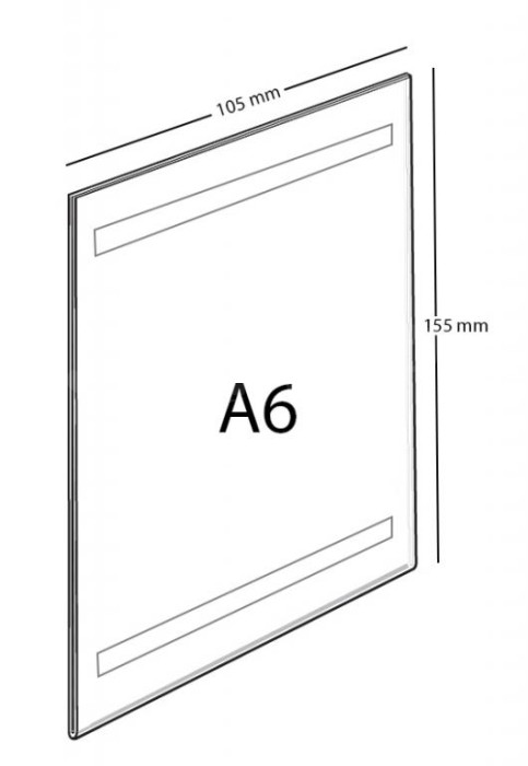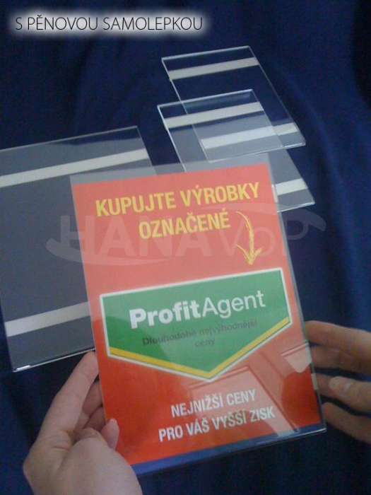 Kapsa na 1 popisku je vyrobena z kvalitního plexiskla tloušťky 2 mm s UV ochranou, ohnutím do "V" s ohybem - základnou po kratší straně, pro vložení 1 ks plakátu (jmenovky, nabídky, cenovky). Kapsa je ze zadní strany opatřena čirou samolepkou. Po odstranění ochranné (červené) fólie se lepí na čistý, odmaštěný a hladký podklad (dveře, sklo atd.). Vložené jmenovky (nabídky, ceníky) lze pak jednoduchým způsobem aktuálně měnit. Doporučujeme použití v interiéru pro jmenovky na dveře, obrazové "MENU" v restauracích, aktuální nabídky CK, nabídky nemovitostí RK, či jiné. Kapsa je na výšku i šířku větší o 5 mm než formát vkládaného papíru. Orientace kapsy na výšku. Rozměry v mm.