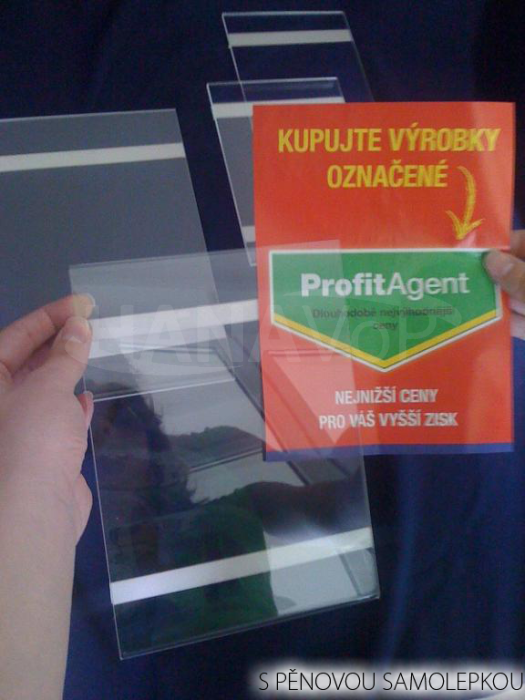 Kapsa na 1 popisku je vyrobena z kvalitního plexiskla tloušťky 2 mm s UV ochranou, ohnutím do "V" s ohybem - základnou po kratší straně, pro vložení 1 ks plakátu (jmenovky, nabídky, cenovky). Kapsa je ze zadní strany opatřena čirou samolepkou. Po odstranění ochranné (červené) fólie se lepí na čistý, odmaštěný a hladký podklad (dveře, sklo atd.). Vložené jmenovky (nabídky, ceníky) lze pak jednoduchým způsobem aktuálně měnit. Doporučujeme použití v interiéru pro jmenovky na dveře, obrazové "MENU" v restauracích, aktuální nabídky CK, nabídky nemovitostí RK, či jiné. Kapsa je na výšku i šířku větší o 5 mm než formát vkládaného papíru. Orientace kapsy na výšku. Rozměry v mm.