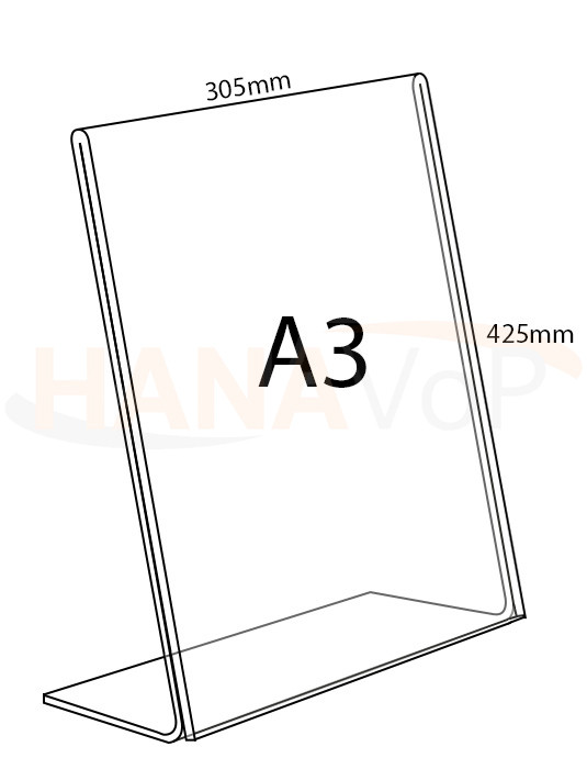 Plexi stojánek typu "L" (přední strana je šikmo k podložce) na formát papíru 420x297mm.